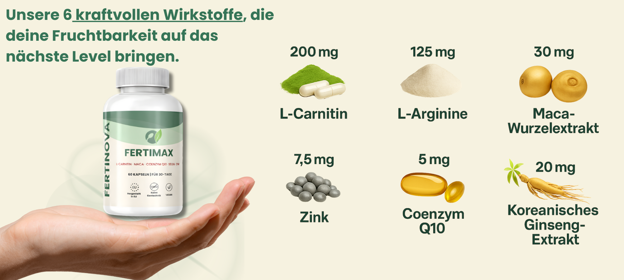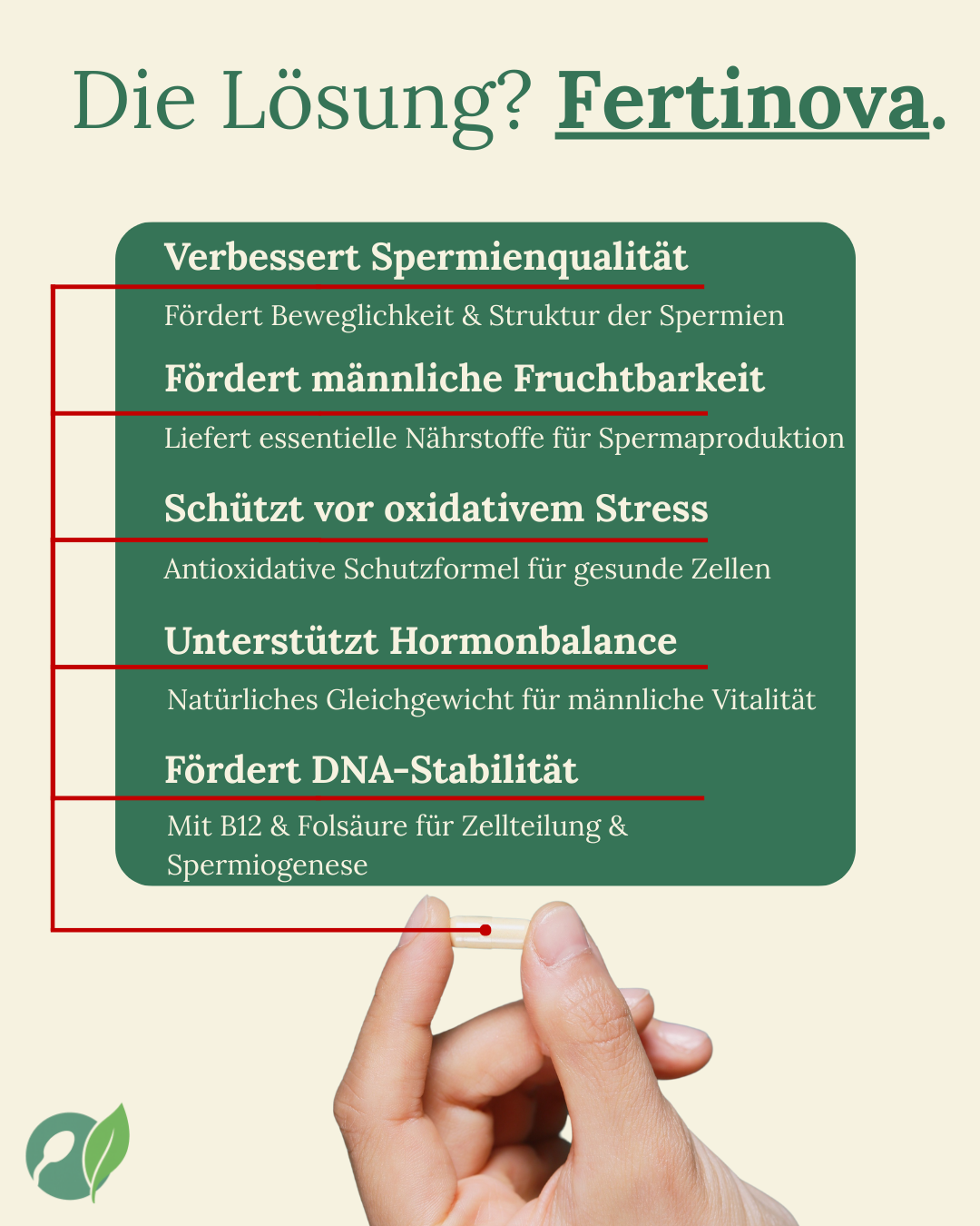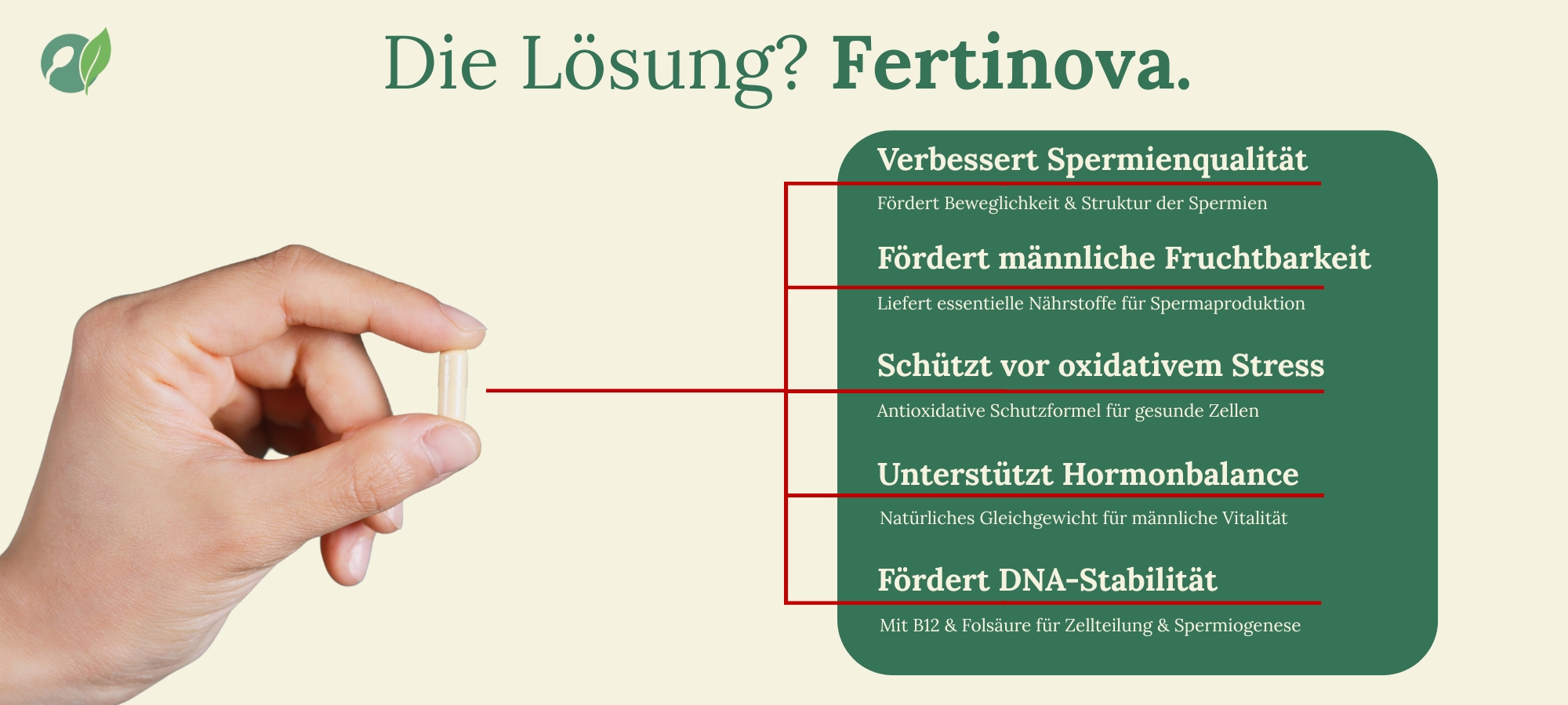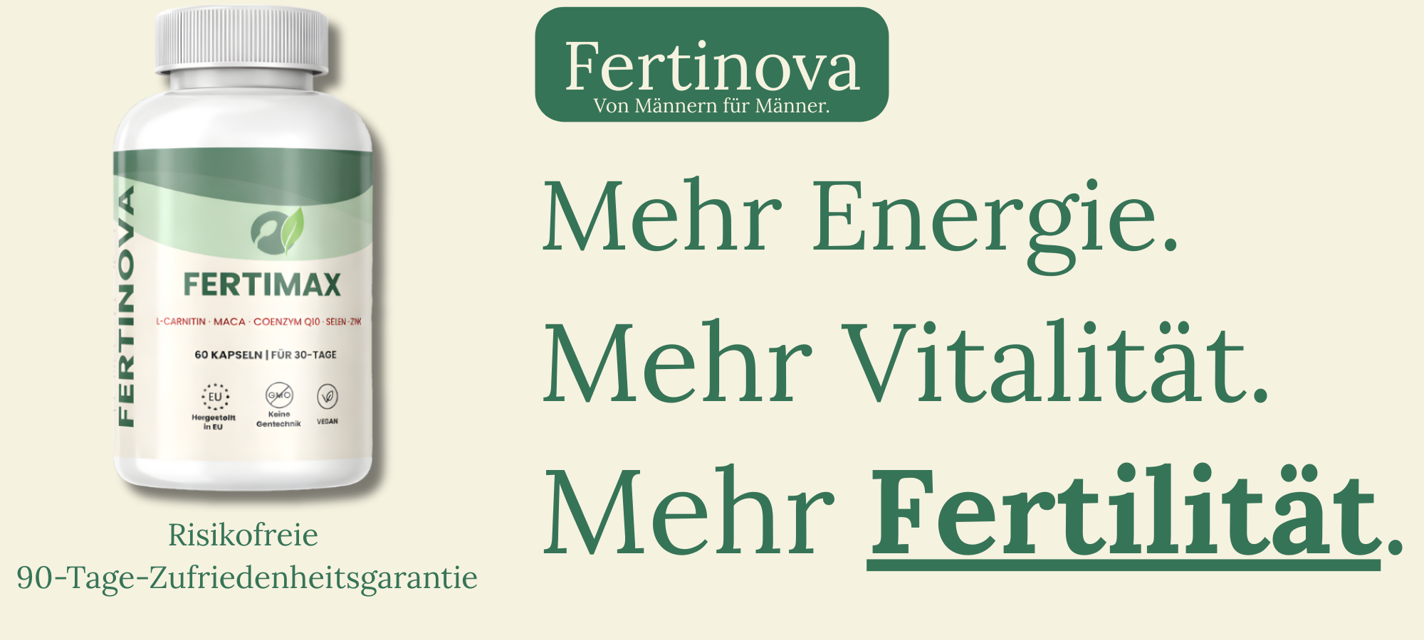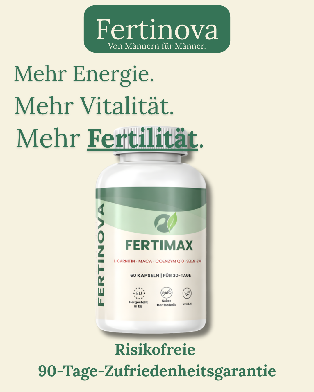 Fertimax von Fertinova setzt genau hier an: eine evidenzorientierte Formel aus Antioxidantien, essenziellen Mikronährstoffen und bewährten Adaptogenen entwickelt, um Spermienqualität, Motilität und Zellschutz zu unterstützen und gleichzeitig Energie, Leistungsfähigkeit und das männliche Wohlbefinden zu fördern.