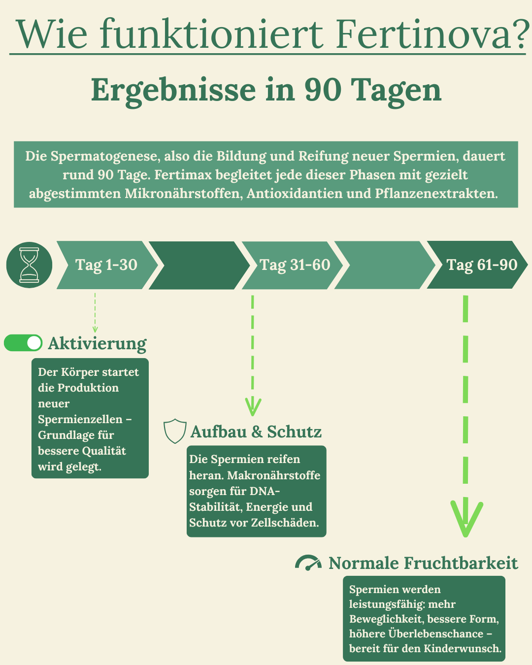 Die Spermaproduktion läuft in Zyklen von ca. 74–90 Tagen. Darum empfehlen wir eine mindestens 90-tägige Einnahme von FertiMax, um messbare Ergebnisse bei Spermienqualität, -anzahl und -beweglichkeit zu unterstützen. Viele Kunden berichten bereits nach 3–6 Wochen mehr Energie und Vitalität, aber sichtbare Effekte auf die Fruchtbarkeit benötigen Zeit.